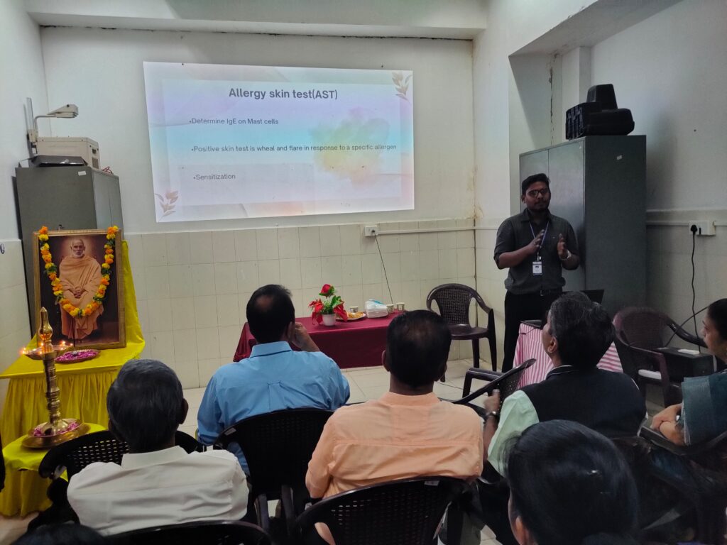 The event was graced by several dignitaries, including Vice Principal and DGM Dr. Joseph V. Francis, Medical Superintendent Dr. Anoop Vincent, AGM Dr. Sasidharan K, Dr. Vijayalakshmi, Dr. Lyla Chacko, Dr. Feroze Kaliyadan and doctors from various departments. Dr. Vijayalakshmi, Associate Professor delivered a warm welcome address. Key members of the department, including Dr. Anju, Dr. Navneeth, Dr. Vrinda, Dr. Kiran, post graduate students, interns, OPD staff were also present to support the inauguration. Following the inauguration there was a talk on “Allergy Skin Test and Immunotherapy” by Dr. Kiran Babu.